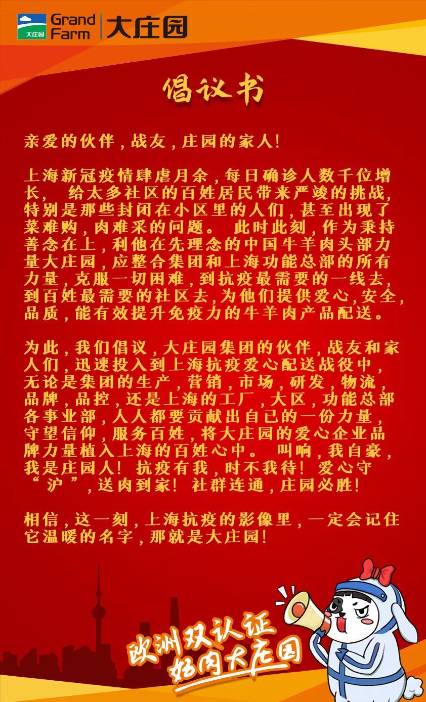 大莊園集團火速成立了“大莊園上??挂邜坌呐渌晚椖拷M”,并向全集團發(fā)出了“共同守“滬” 莊園有我”的倡議書。