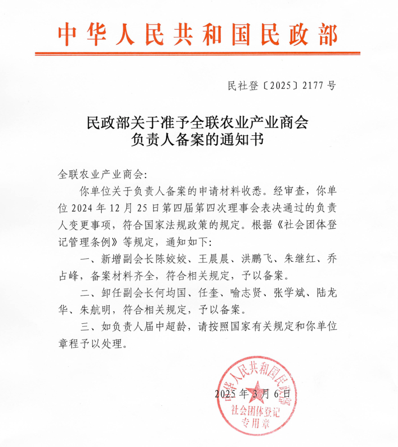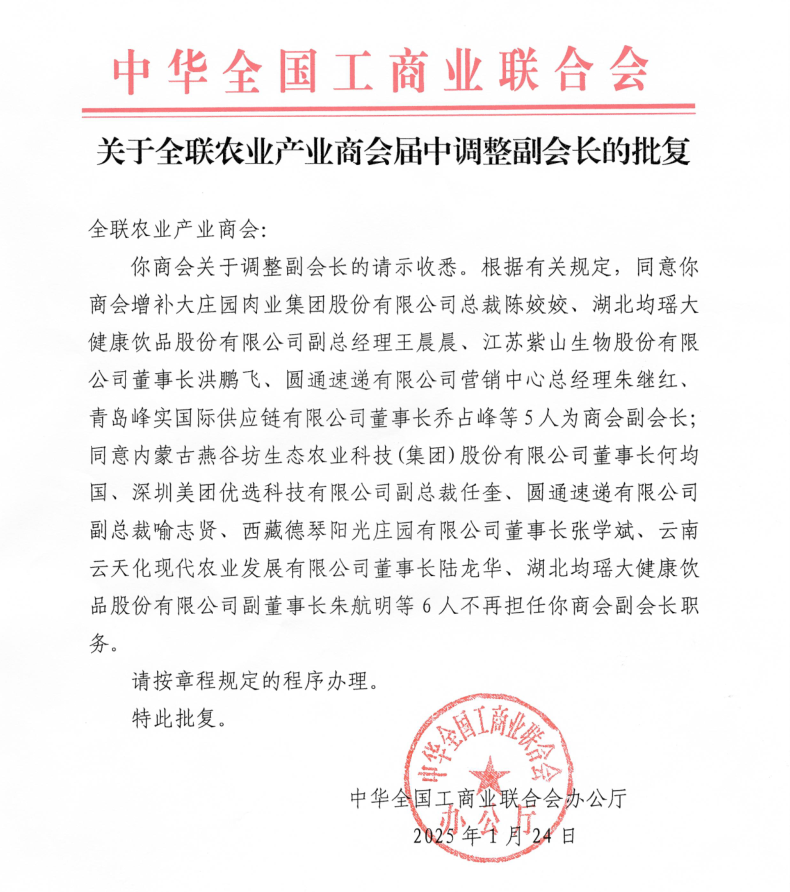 在大會(huì)正式召開之前,全國工商聯(lián)農(nóng)業(yè)產(chǎn)業(yè)商會(huì)還召開了第四屆第四次理事會(huì)、第七次常務(wù)理事會(huì)暨第九次會(huì)長辦公會(huì)。會(huì)議匯報(bào)了2024年商會(huì)工作情況及2025年工作計(jì)劃,并審議通過了新增及調(diào)整副會(huì)長人員名單,分支機(jī)構(gòu)成立的申請和論壇活動(dòng)管理制度等事項(xiàng),并傳達(dá)全國工商聯(lián)沈瑩書記一行調(diào)研商會(huì)時(shí)的講話要點(diǎn)。大莊園集團(tuán)總裁陳姣姣當(dāng)選全國工商聯(lián)農(nóng)業(yè)產(chǎn)業(yè)商會(huì)副會(huì)長。